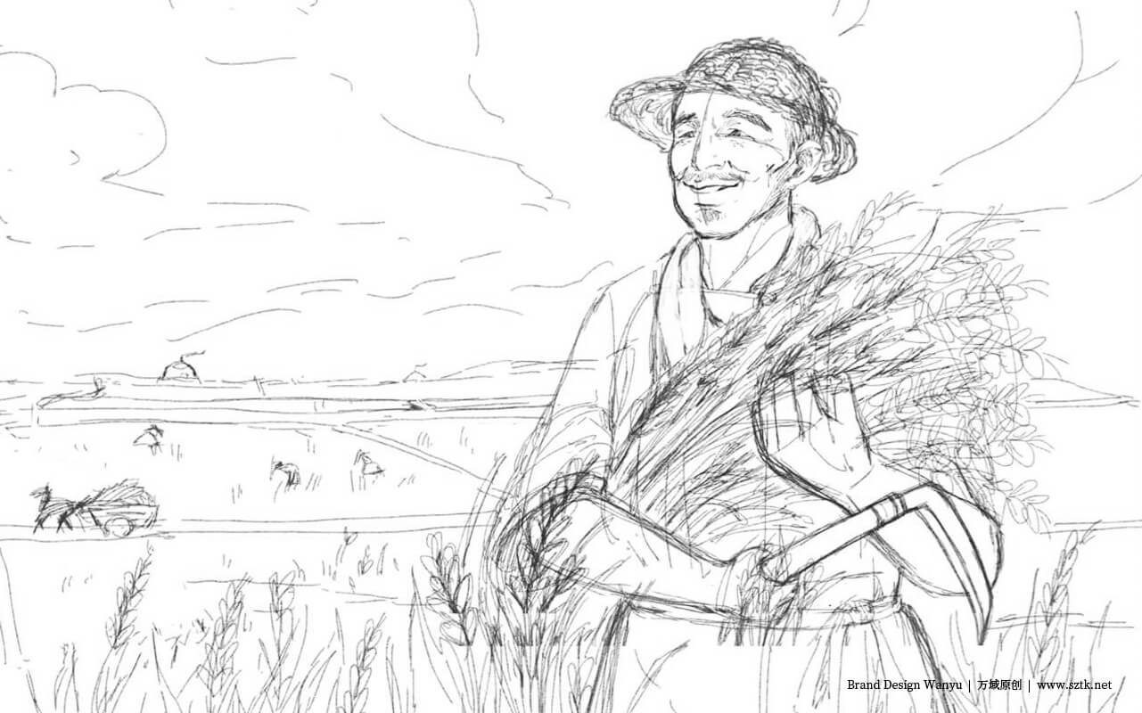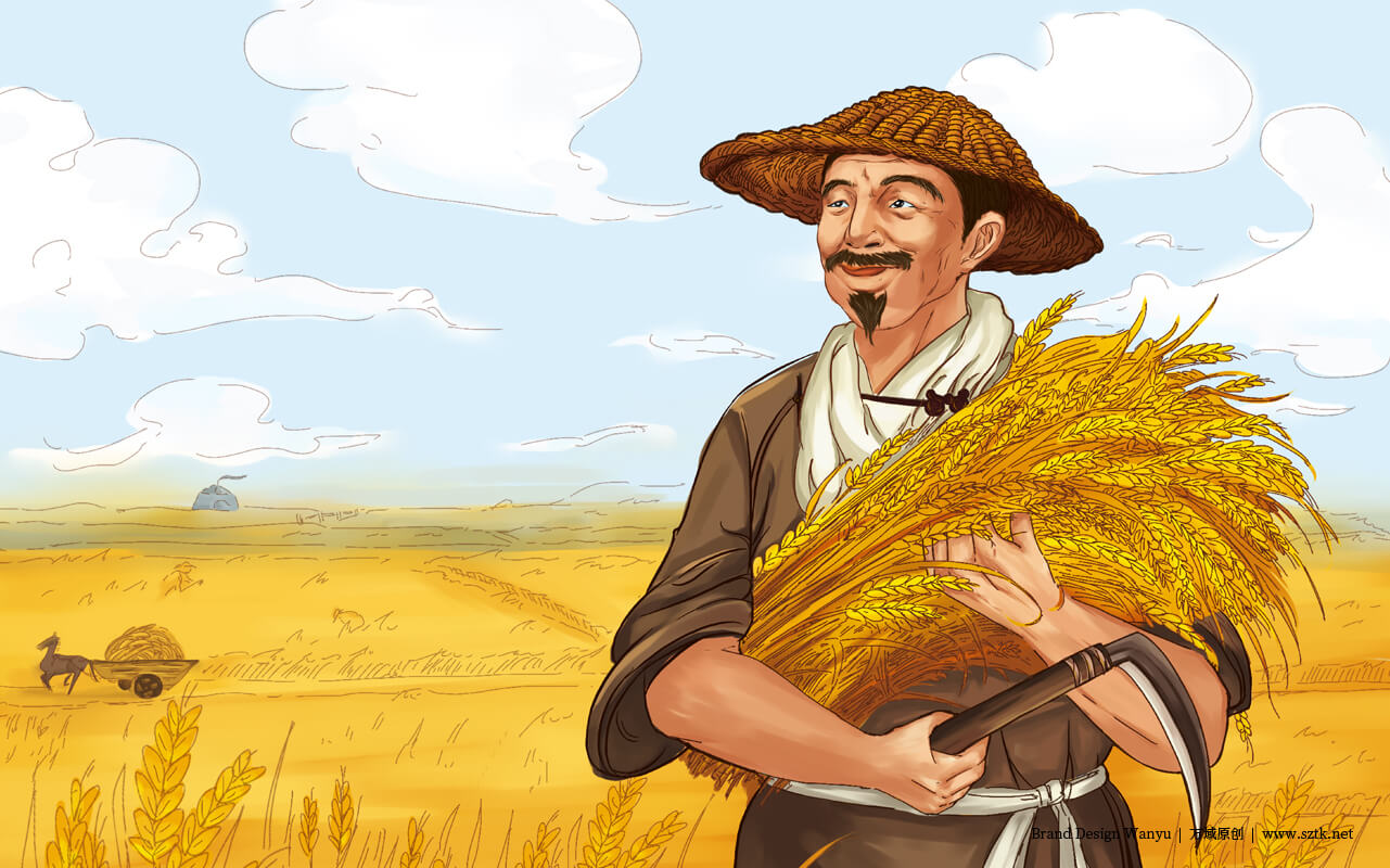 突出老農民爺爺人物要,背景是一大片麥地與遠處農民勞作豐收收割畫面,背景柔和。