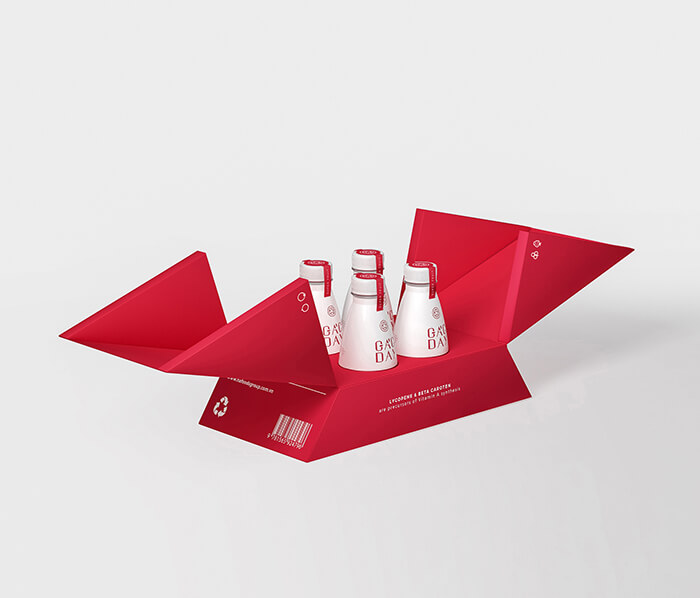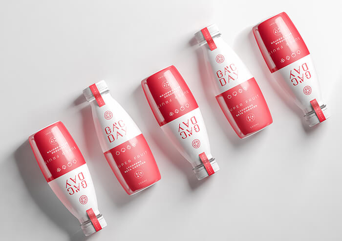 Gacday是一種每日營養飲料,是專門為減輕體內健康、保護心血管系統、促進細胞再生、增強免疫系統而研制的。其豐富的成分,包括強大的抗氧化劑-維生素和番茄紅素有助于預防癌癥,而β-胡蘿卜素有助于改善視力和皮膚健康。排版和內容被選擇為清晰和突出的白色顯示在紅色背景。瓶子是由回收塑料制成,適合從歐洲到越南,再到B2B渠道運輸、保存。