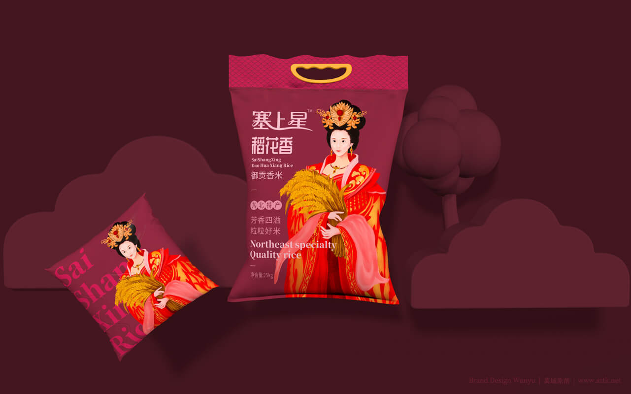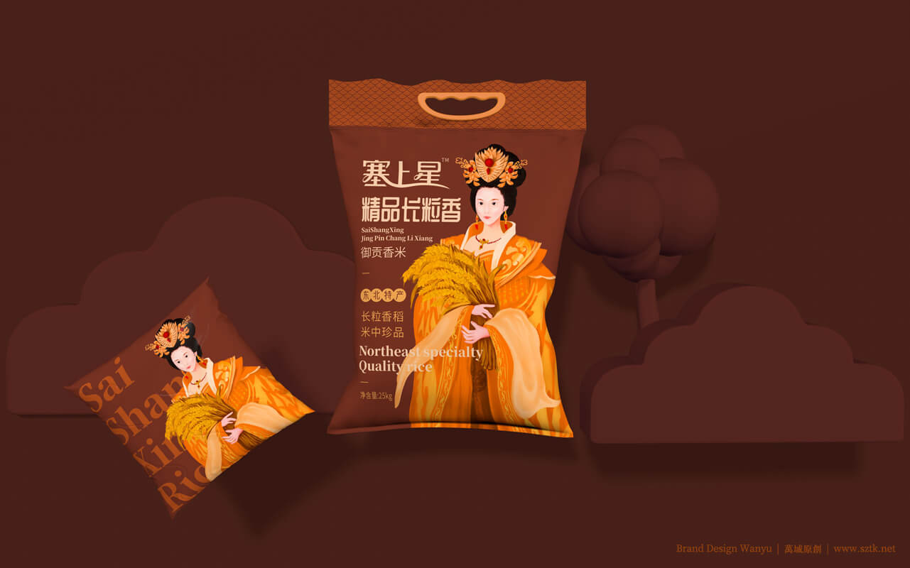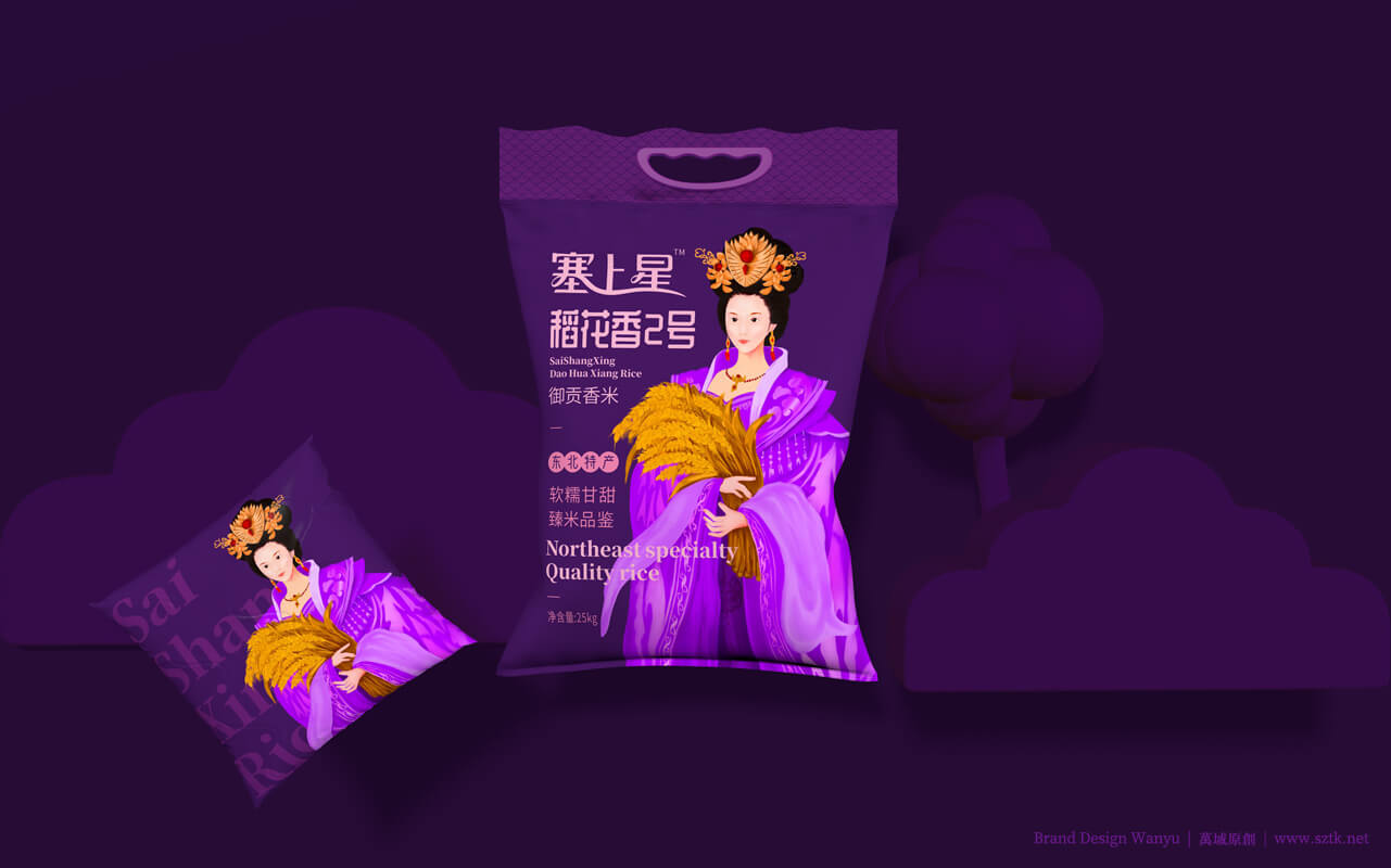 創意主題《皇家小姐》設計手繪出“面帶笑容的美麗的皇家小姐姐”形象。帶有皇家文化特點。美麗動人,拉近消費者距離。動作設置:面容嬌美,手抱小簇稻穗。突出皇家小姐姐人物背景柔和。萬域包裝設計公司是一家創意米包裝設計,大米包裝設計,有機米包裝設計,塞上星御貢香米包裝設計公司,大米包裝設計公司,有機米包裝設計公司,農產品包裝設計公司