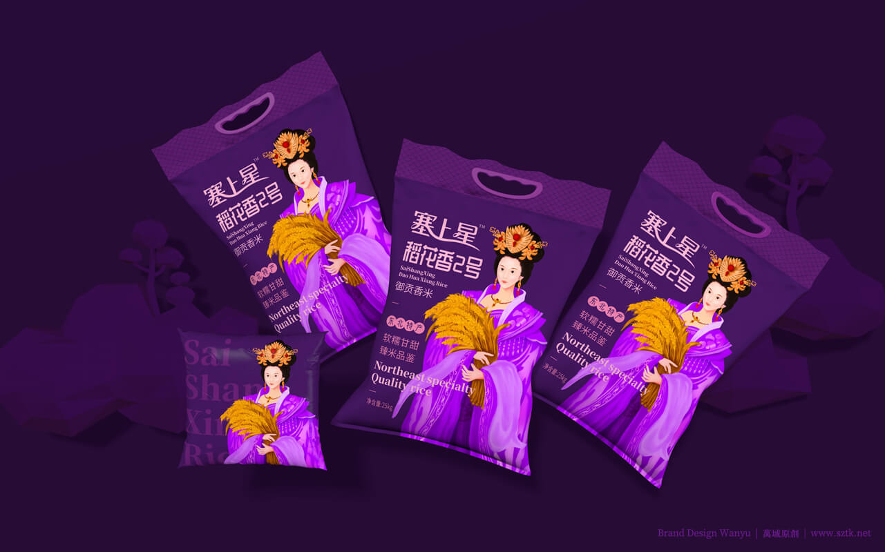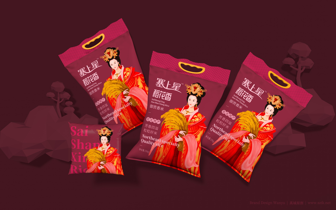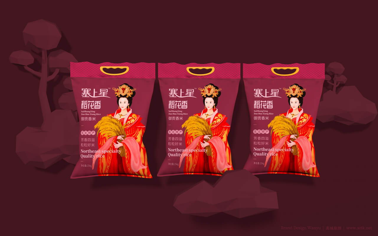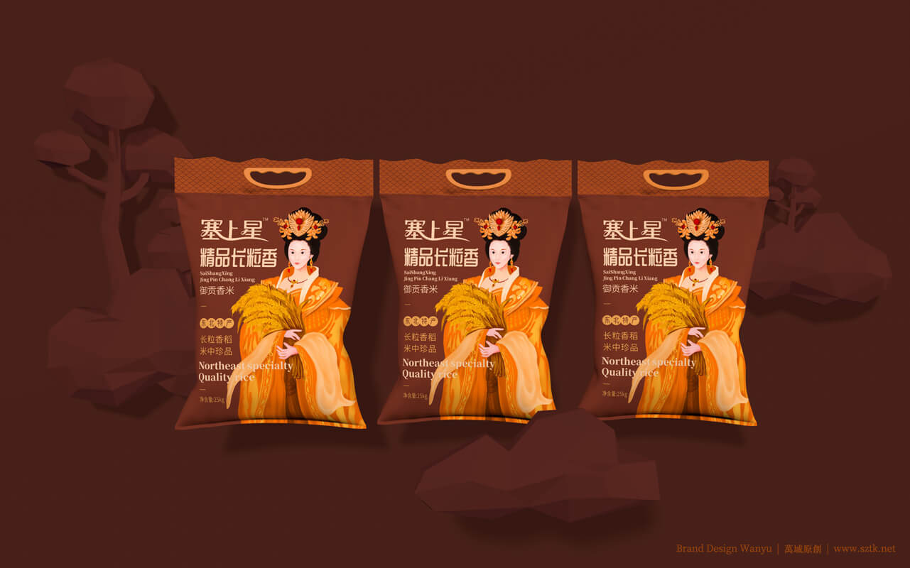 創意主題《皇家小姐》設計手繪出“面帶笑容的美麗的皇家小姐姐”形象。帶有皇家文化特點。美麗動人,拉近消費者距離。動作設置:面容嬌美,手抱小簇稻穗。突出皇家小姐姐人物背景柔和。萬域包裝設計公司是一家創意米包裝設計,大米包裝設計,有機米包裝設計,塞上星御貢香米包裝設計公司,大米包裝設計公司,有機米包裝設計公司,農產品包裝設計公司