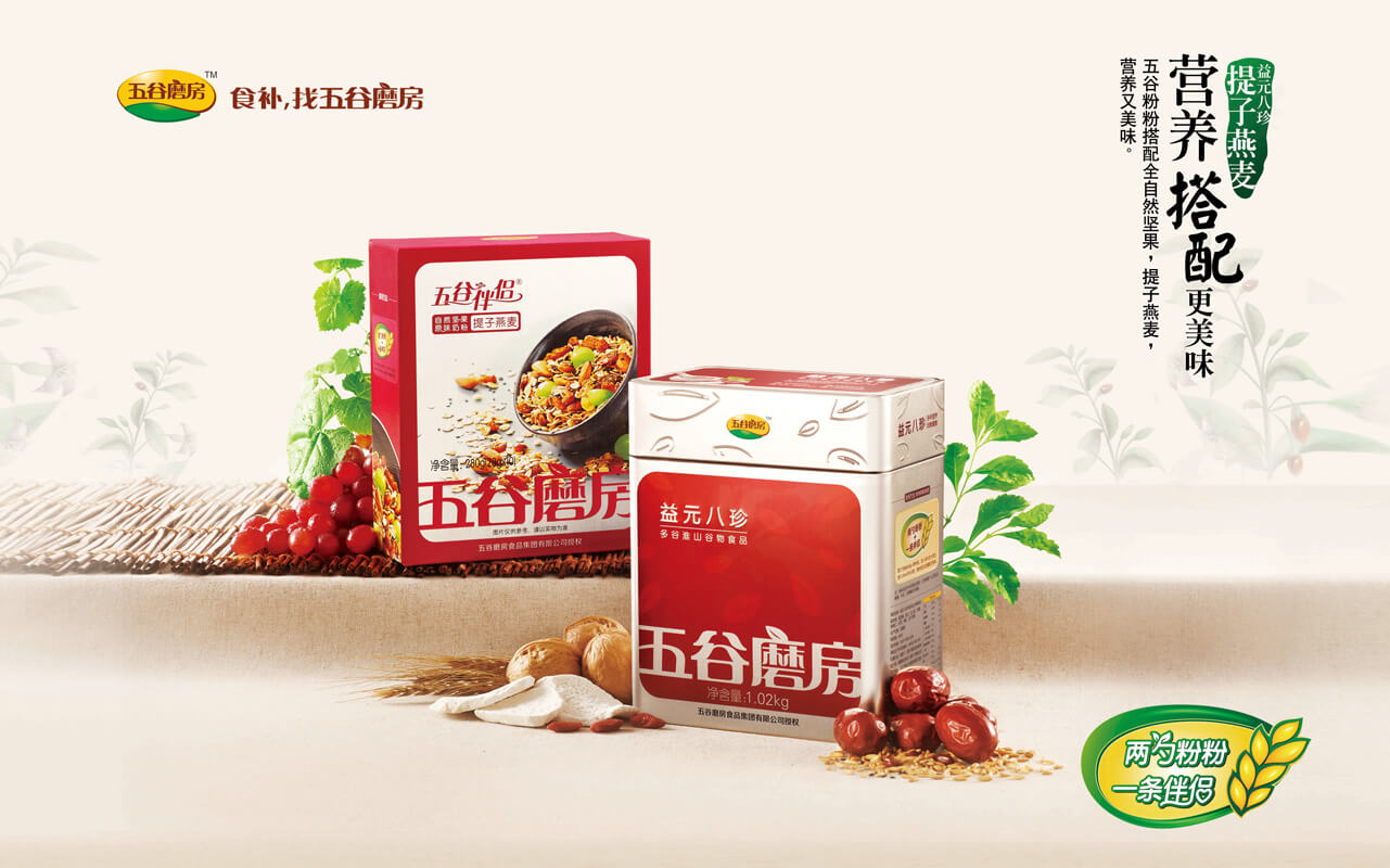 客戶名稱 : 深圳五谷磨房食品集團 / 服務內容 : 全案服務,五谷磨房產品包裝設計,SI設計,書刊設計 / 創作日期 : 2016-2019 品牌定位升級 由“健康是磨出來的”  到“食補找五谷磨房”